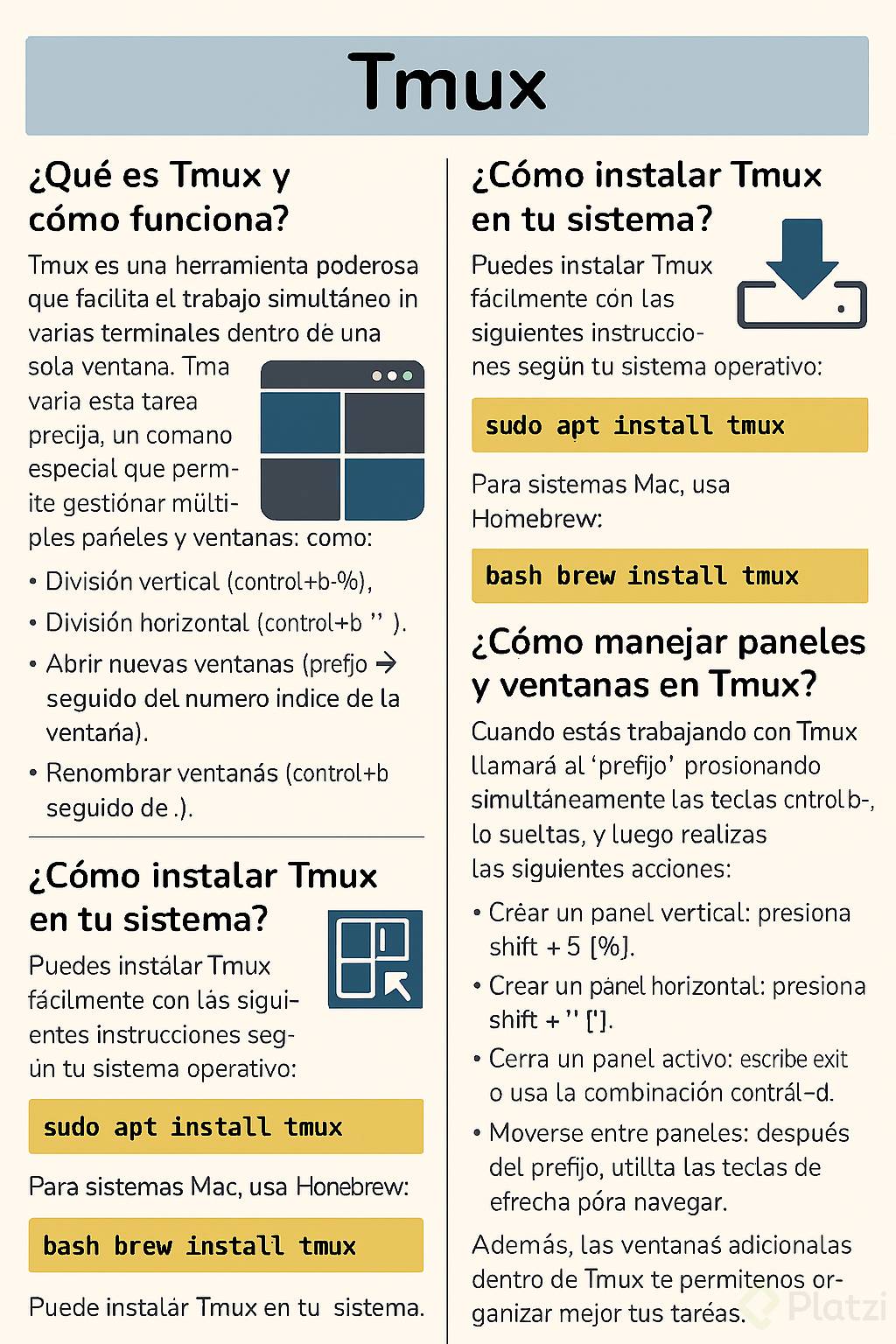 Tmux es una herramienta poderosa que facilita el trabajo simultáneo en varias terminales dentro de una sola ventana. Trabaja mediante lo que se denomina "prefijo", una combinación de teclas específica (generalmente control+b), seguida de ciertos comandos para realizar diversas acciones, tales como: