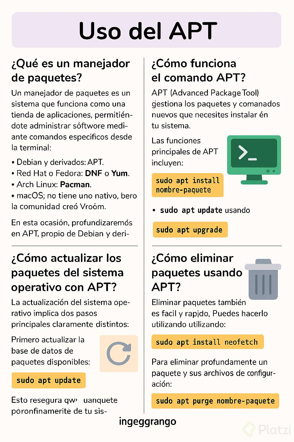 APT (Advanced Package Tool) gestiona los paquetes y comandos nuevos que necesites instalar en tu sistema. Las funciones principales de APT incluyen: