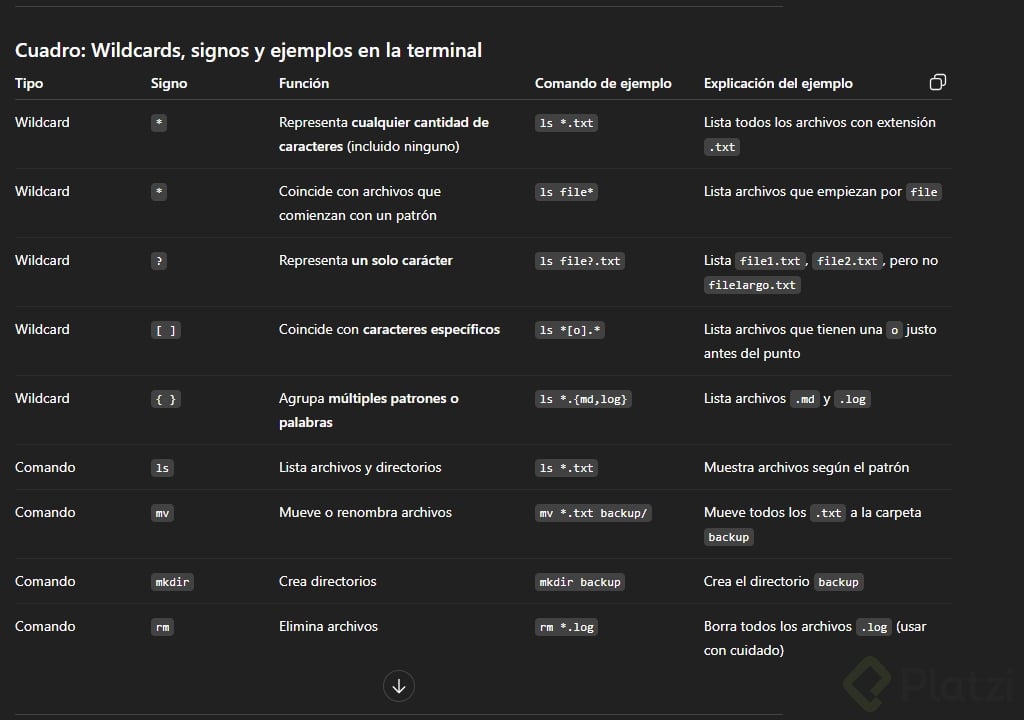 Además, toma en cuenta que los wildcards pueden variar ligeramente según la Shell que utilices (bash, ZSH, entre otras). Si algo no funciona exactamente como esperas, verifica la documentación específica de tu Shell.