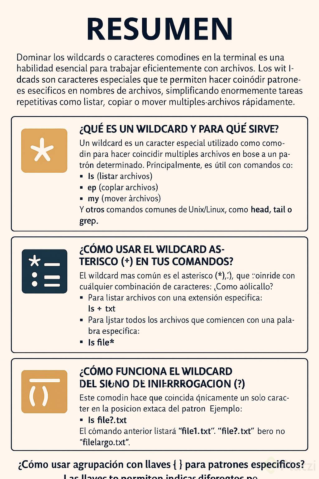 Dominar los wildcards o caracteres comodines en la terminal es una habilidad esencial para trabajar eficientemente con archivos. Los wildcards son caracteres especiales que te permiten hacer coincidir patrones específicos en nombres de archivos, simplificando enormemente tareas repetitivas como listar, copiar o mover múltiples archivos rápidamente.