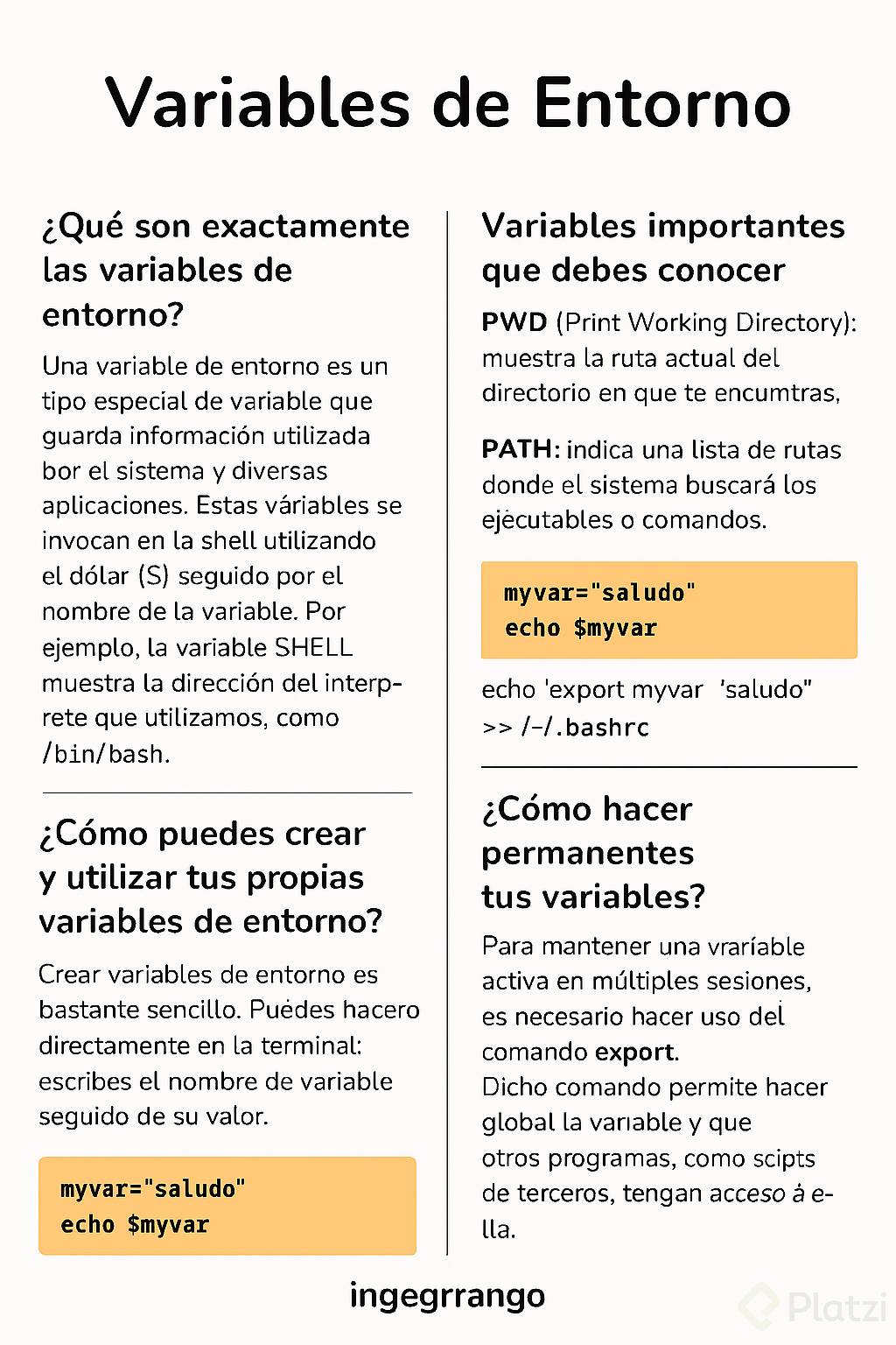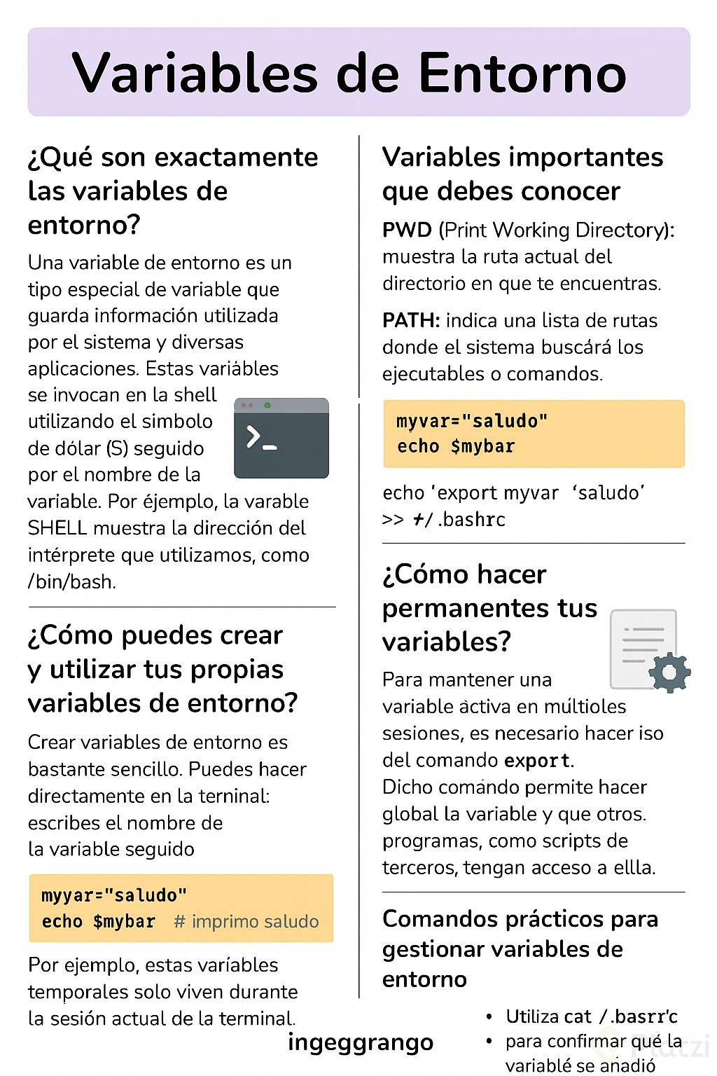 Una variable de entorno es un tipo especial de variable que guarda información utilizada por el sistema y diversas aplicaciones. Estas variables se invocan en la shell utilizando el símbolo de dólar ($) seguido por el nombre de la variable. Por ejemplo, la variable SHELL muestra la dirección del intérprete que utilizamos, como /bin/bash.