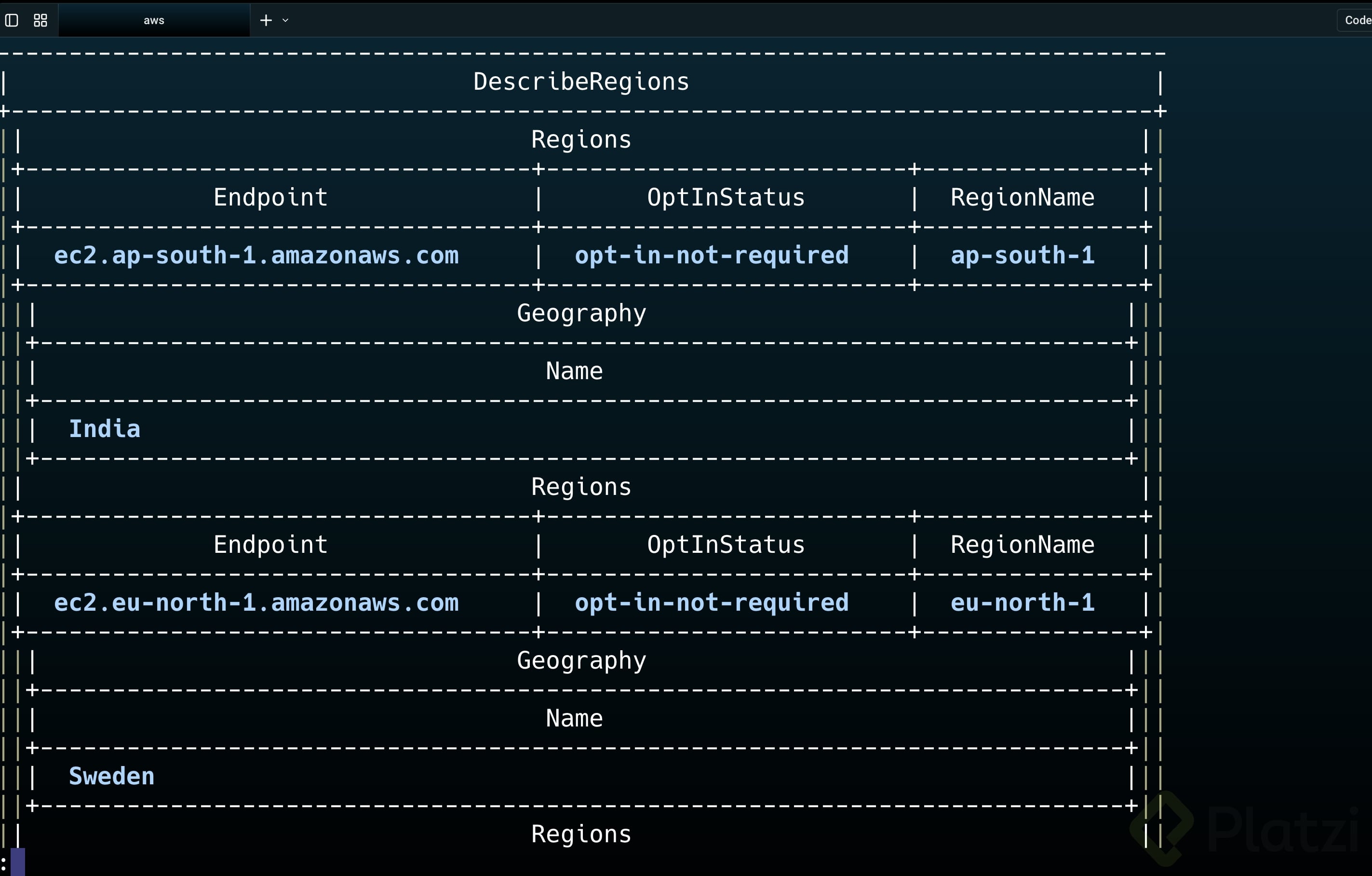 Este comando te mostrará un archivo JSON con todas las ubicaciones disponibles, donde deberás elegir la que esté más cercana geográficamente para minimizar la latencia en la creación de tus recursos.