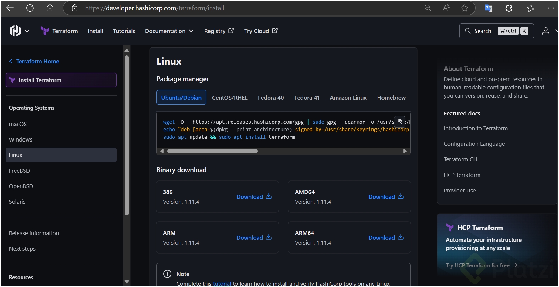 Referirse al Manual de Instalación de Terraform: Dirígete a la página de instalación oficial de Terraform. Dentro de las opciones para Linux, selecciona la guía para Ubuntu o Debian.