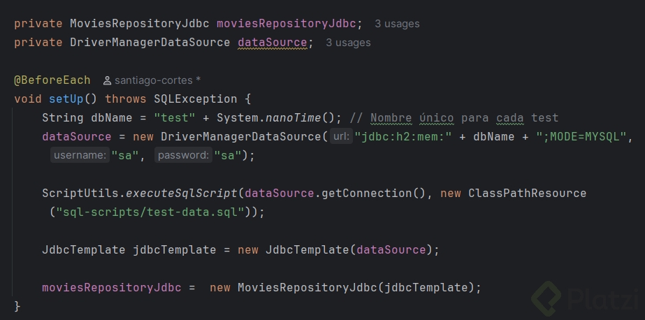 Por el momento, nuestras pruebas están cargando varias veces la información de la base de datos y vamos a solucionar este problema creando una función que borre la información. Para esto, debemos usar la instrucción @After para que JUnit ejecute la función cada vez que termina de hacer un test.