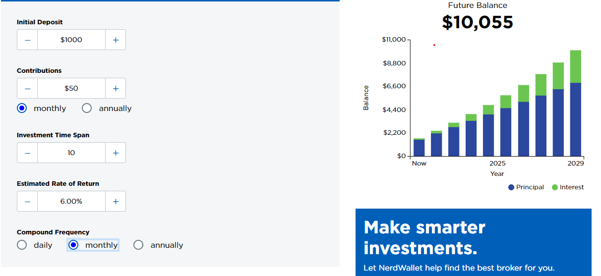 Aclaración: el resultado final es 10.173 USD teniendo en cuenta un valor inicial de 1000 USD, un depósito mensual de 50 USD e interés anual de 6%.