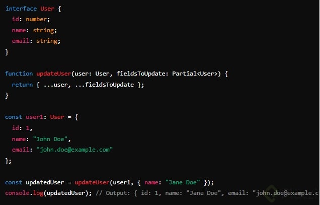 Hemos usado Partial para hacer que todas las propiedades de User sean opcionales. Por lo tanto, el nuevo tipo PartialUser tiene las propiedades id, name, email y phoneNumber, pero todas ellas son opcionales.
