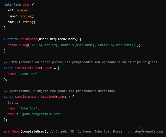Hemos empleado Required para hacer que todas las propiedades de User sean obligatorias. Por lo tanto, el nuevo tipo RequiredUser tiene las propiedades id, name, email y phoneNumber, pero todas ellas son obligatorias.
