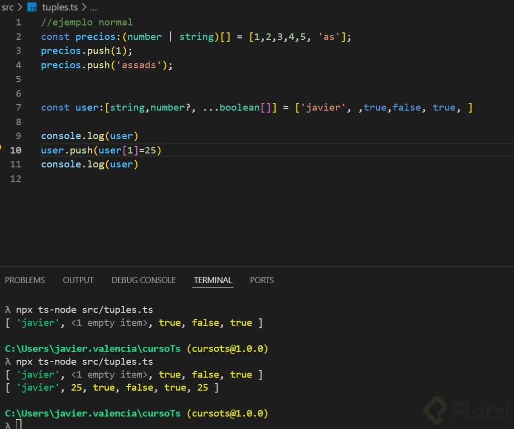 user = ['nico', 20]; // Correcto: el primer elemento es del tipo `string` y el segundo de tipo `number`