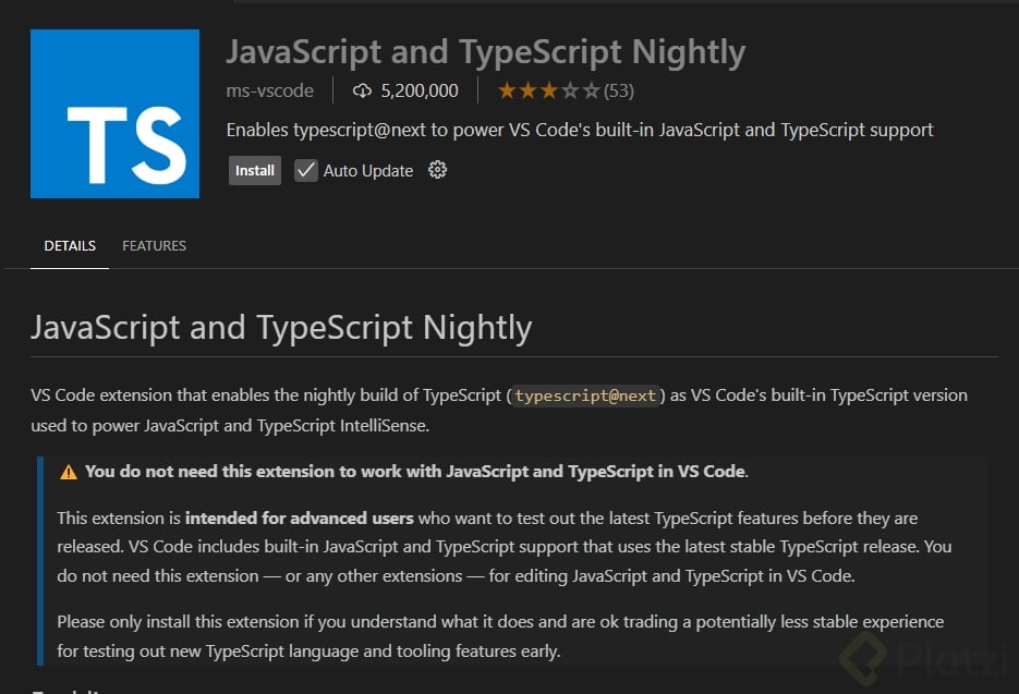 - Localiza "JavaScript and TypeScript Nightly" de Microsoft