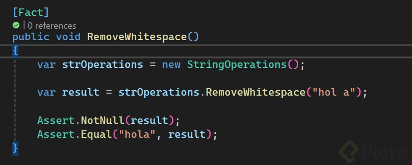 Ahora, un desafío es aplicar estas enseñanzas en la función removeWhitespace, que elimina espacios en blanco de un string. Siguiendo la estructura AAA y utilizando las diversas opciones de assert ofrecidas por XUnit, podemos crear robustas pruebas unitarias que fortalezcan nuestro código.