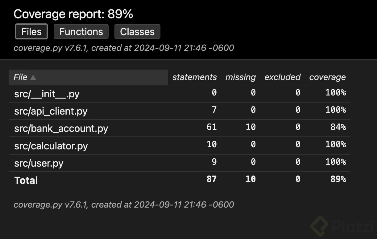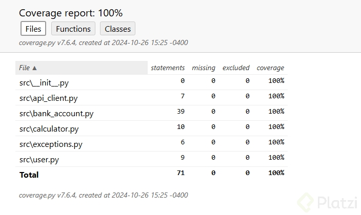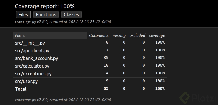 pip freeze | grep coveragepara agregar la librería a tu archivo de requirements. - Una vez instalada, ejecuta el comando