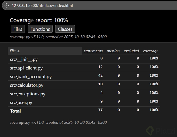 coverage reportpara obtener un resumen de las pruebas. - Si quieres un reporte visual más detallado, ejecuta