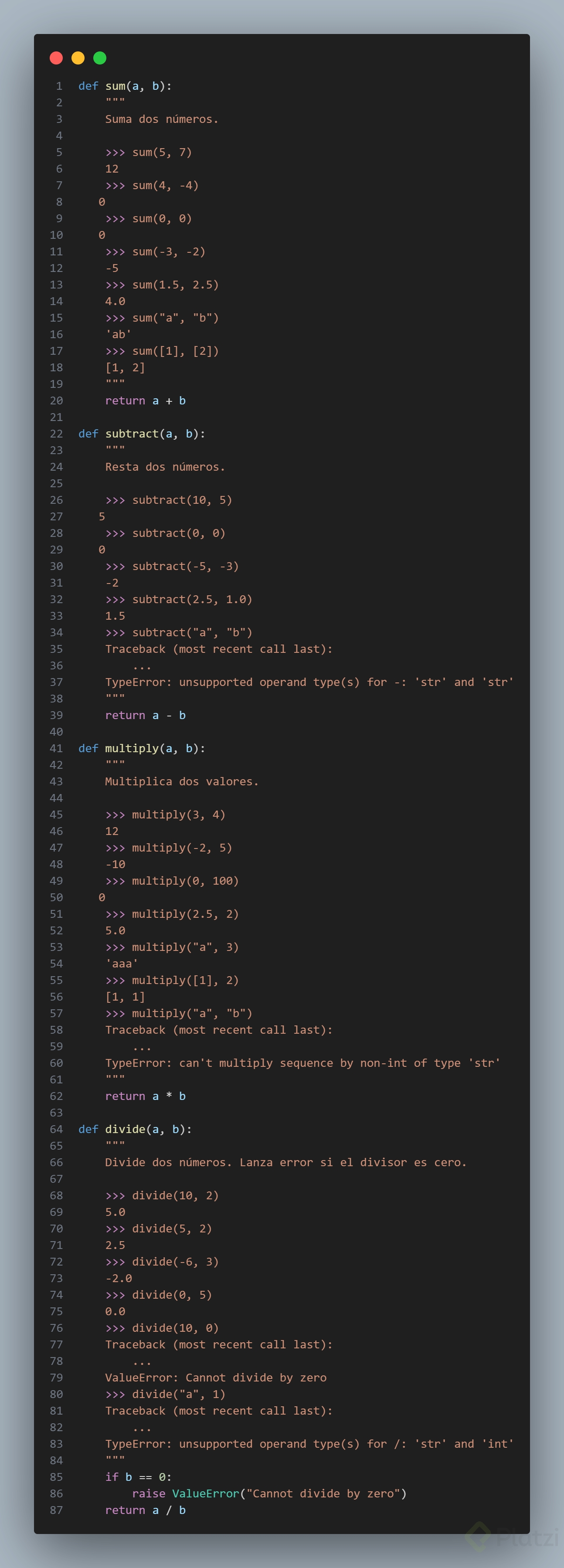 Doctest es una librería que está incluida en Python y que permite crear pruebas en los comentarios del código. Esto lo hace práctico ya que puedes escribir pruebas de manera muy similar a una sesión interactiva de Python. Solo debes añadir los ejemplos dentro de los comentarios y ejecutarlos con el comando python -m doctest.