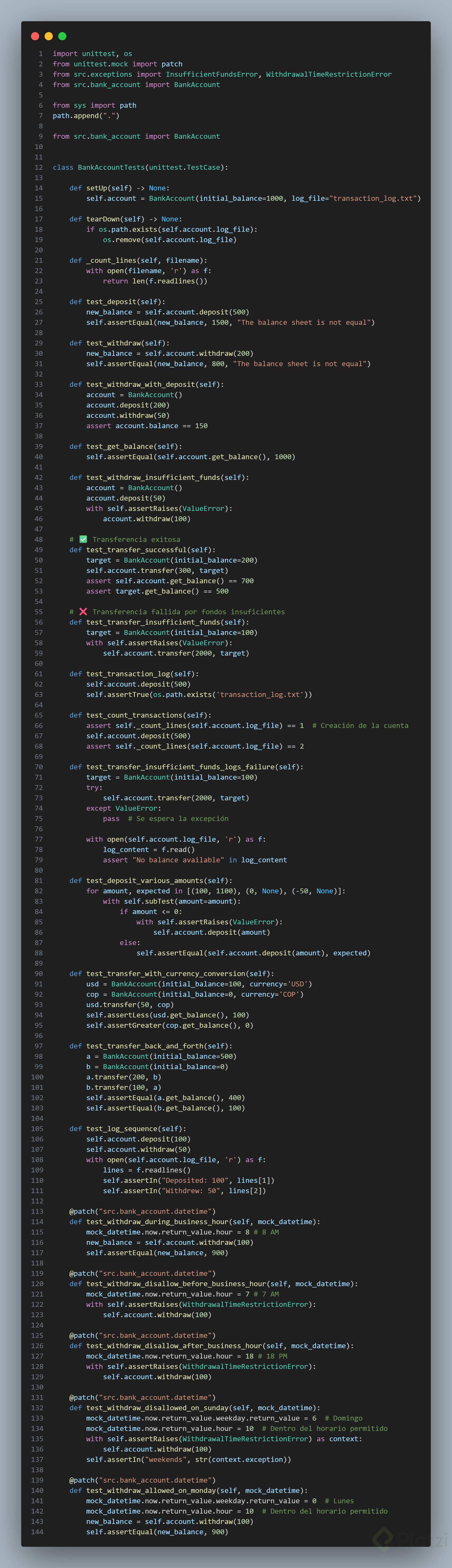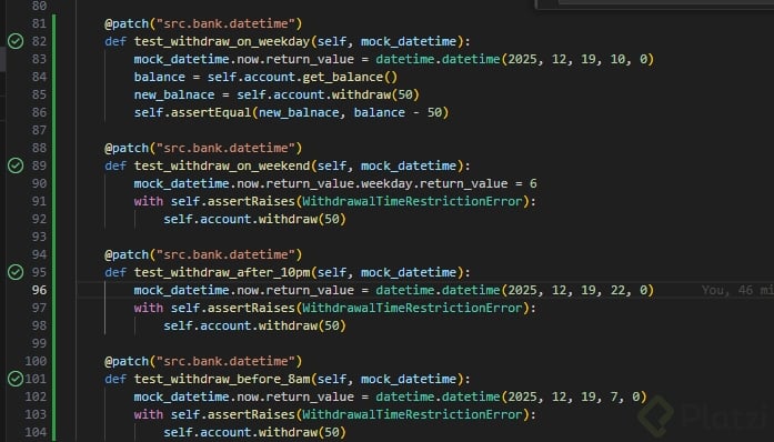 patch, podemos definir un valor de retorno específico paranow(), como las 7 AM o las 10 AM. - De esta forma, se puede validar que la excepción se lance correctamente si el retiro ocurre fuera del horario permitido.