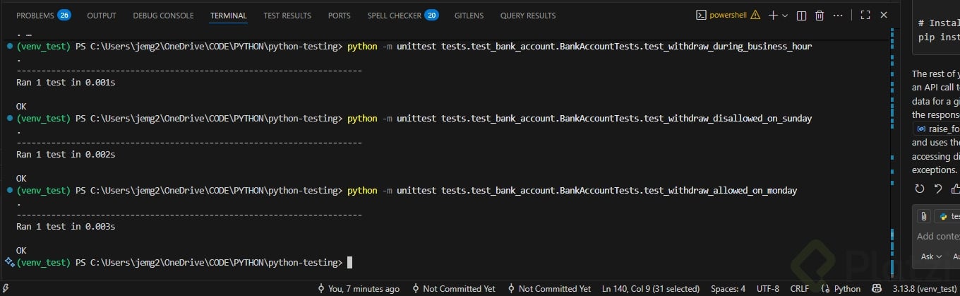 En esta lección, hemos aprendido a modificar el comportamiento de objetos y funciones dentro de nuestras pruebas en Python, utilizando técnicas como el patch para simular situaciones específicas, como el control del horario de retiro en una cuenta bancaria. Esta habilidad es crucial cuando necesitamos validar restricciones temporales o cualquier otra lógica de negocio que dependa de factores externos, como el tiempo.