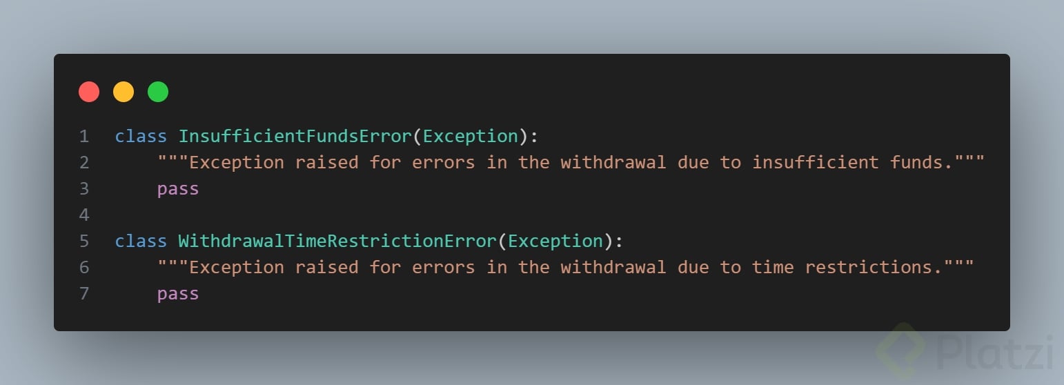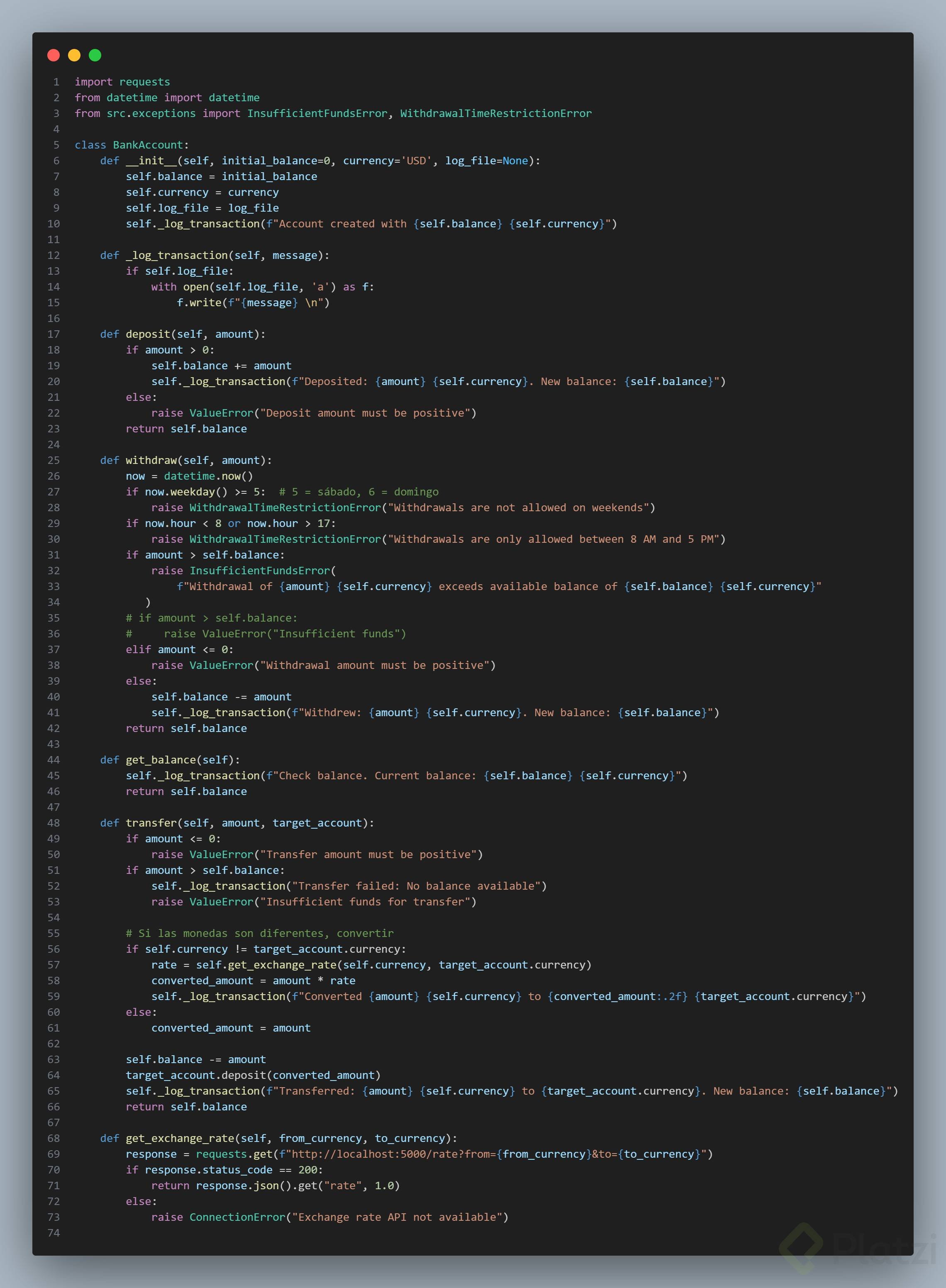 Para implementar la restricción de horario, se utilizó la clase datetime para obtener la hora actual. Definimos que los retiros solo pueden realizarse durante el horario de oficina: entre las 8 AM y las 5 PM. Cualquier intento fuera de este horario lanzará una excepción personalizada llamada WithdrawalError.