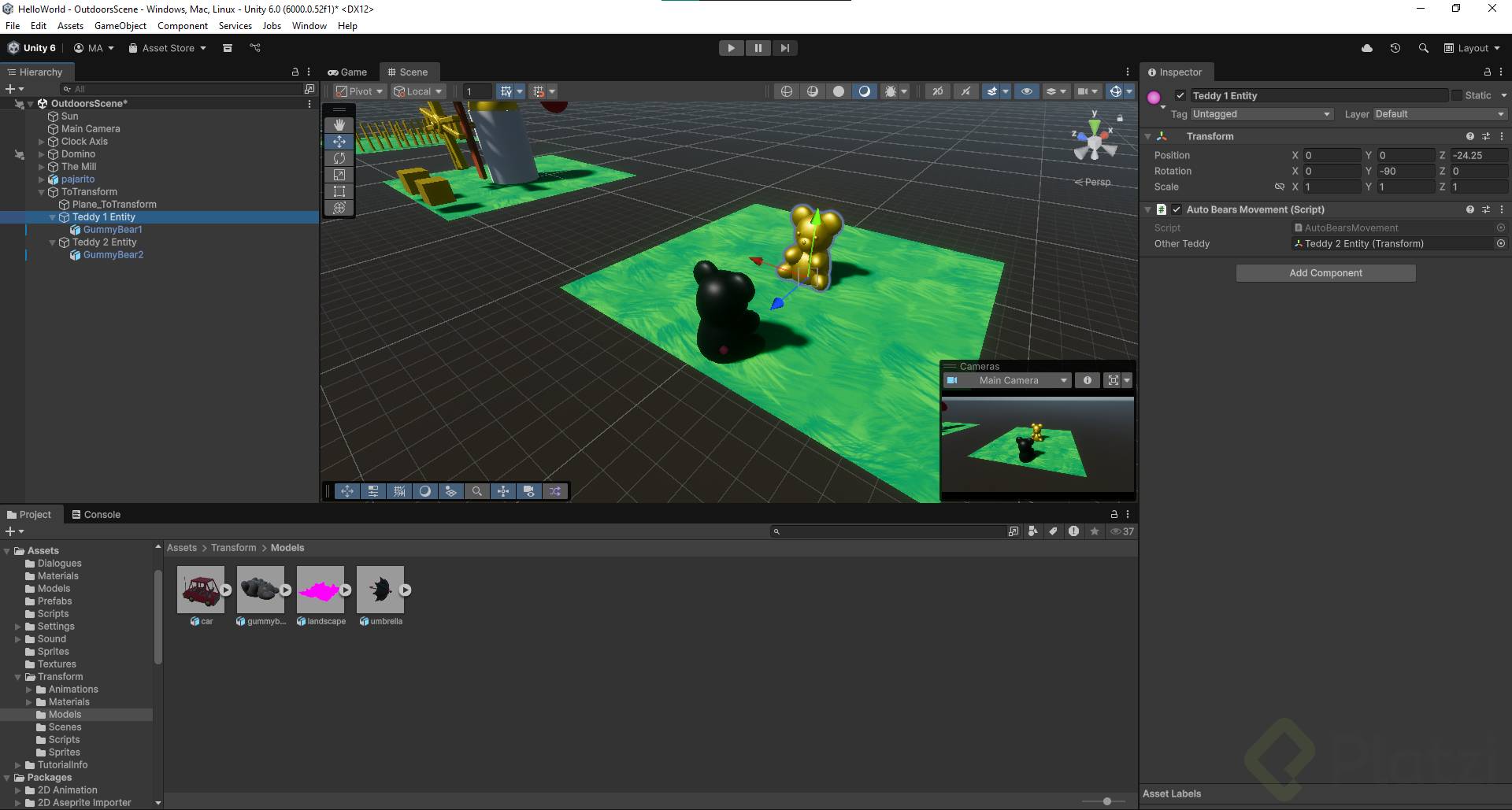 Para ilustrar cómo funciona todo esto, se puede seguir un ejemplo práctico con dos objetos (teddy). El objetivo es hacer que un teddy (el observador) siempre mire hacia el otro teddy (el objetivo). Este proceso se lleva a cabo mediante la manipulación del vector direccional forward del transform. A continuación, se muestra cómo se implementa esto en código: