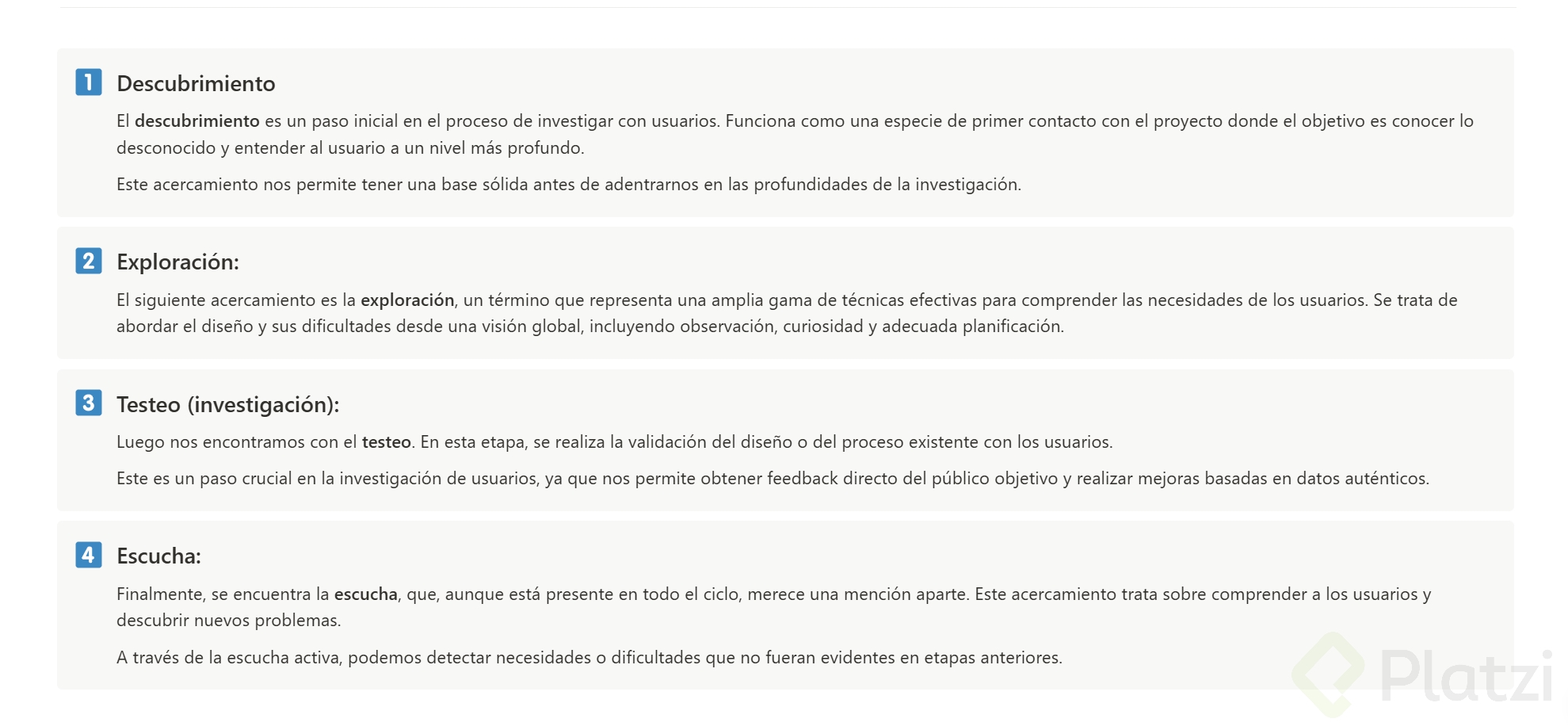 Finalmente, se encuentra la escucha, que, aunque está presente en todo el ciclo, merece una mención aparte. Este acercamiento trata sobre comprender a los usuarios y descubrir nuevos problemas.