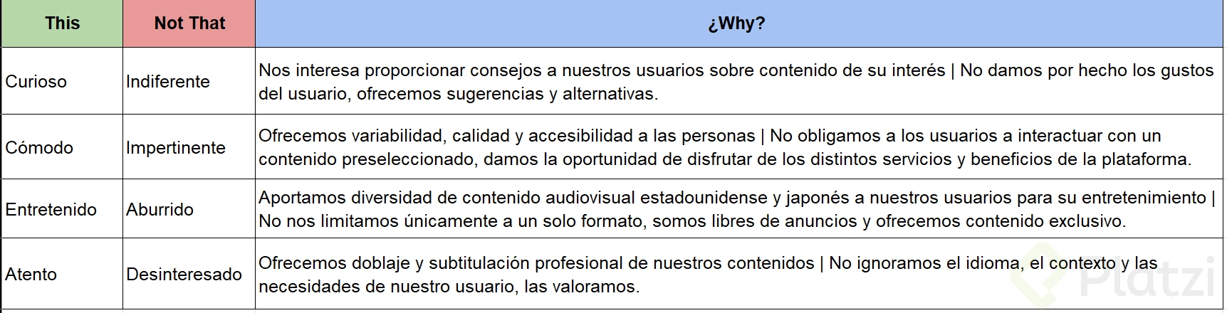 - Platzi: Retador, inspirador y enfocado en la enseñanza.