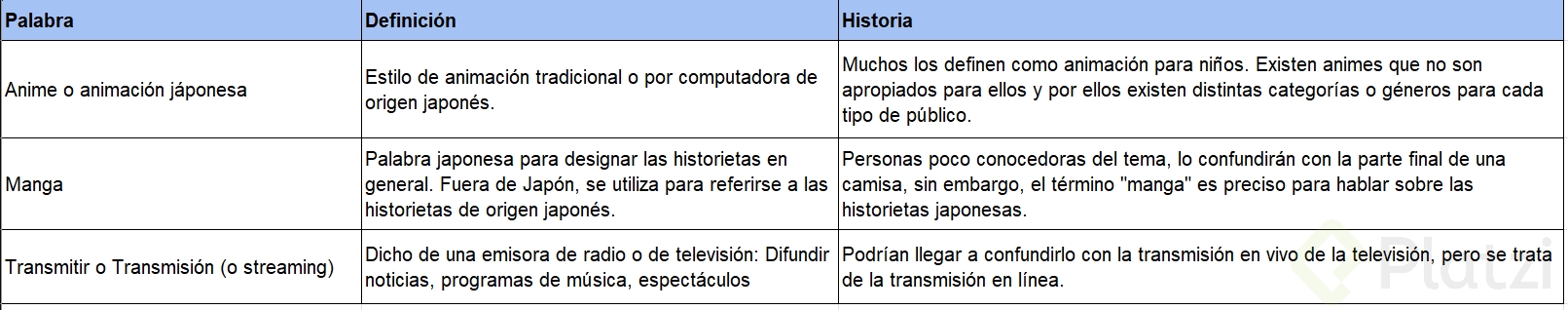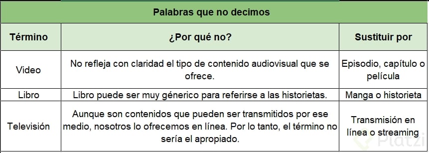 Palabras prohibidas: Establecer términos que no deben ser usados, como "video" en lugar de "clase" en contextos educativos, asegurando que el término incorrecto no desvirtúe el valor educativo deseado.