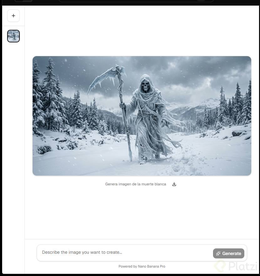 - Describe la interfaz: campo de prompt, generación con Nano Banana Pro, vista de muchas imágenes y sidebar para navegar.