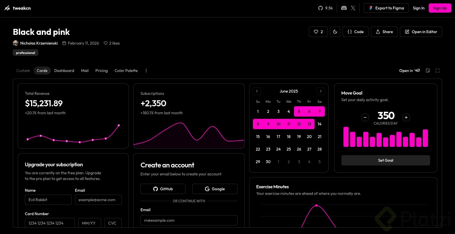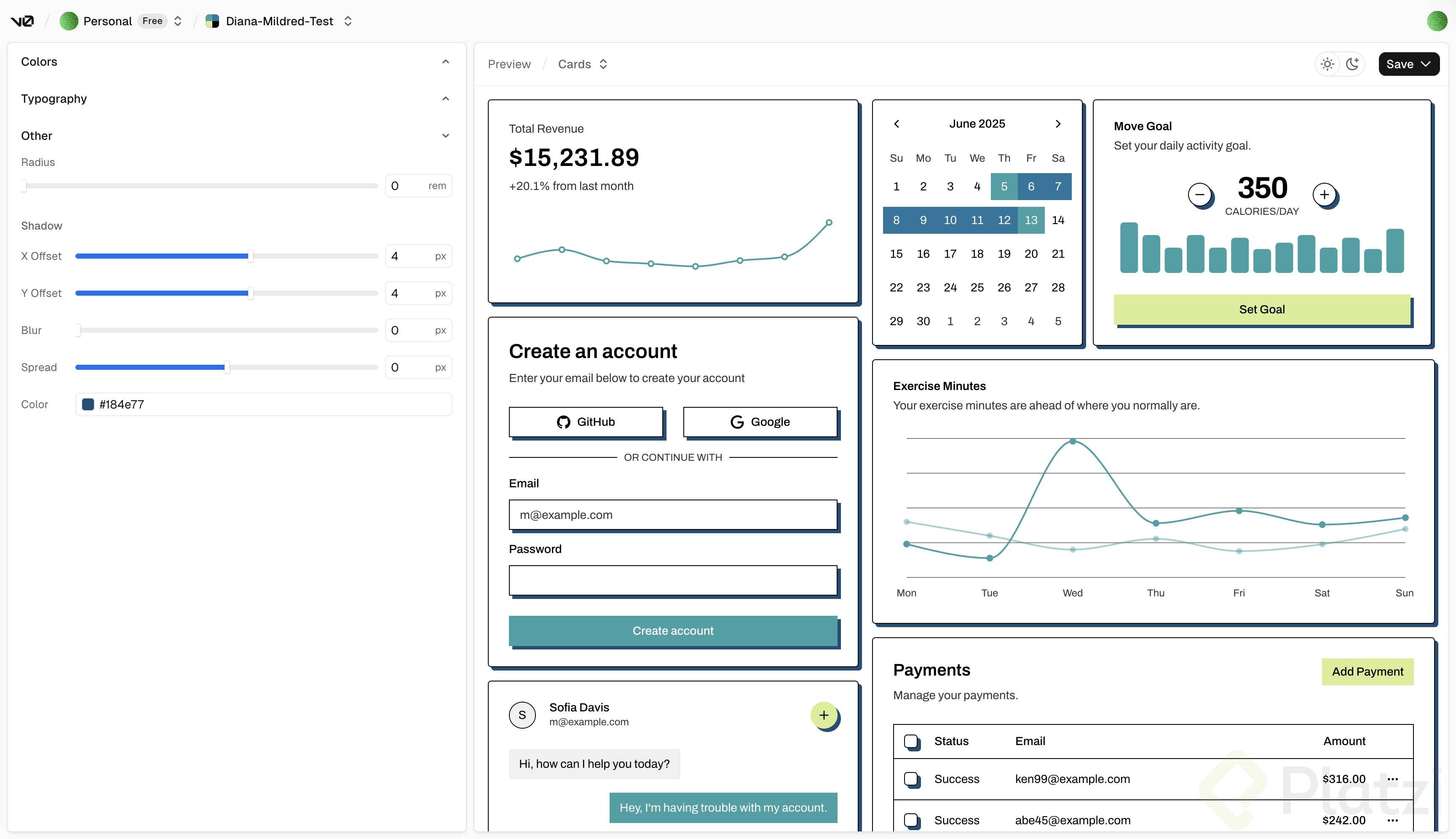 TweakCN es una herramienta útil para testear design systems con una librería amplia de ejemplos, incluso de apps conocidas como Twitter. Su interfaz es similar a la de Vcero, con colores agrupados, tipografías y controles como spacing y radio.