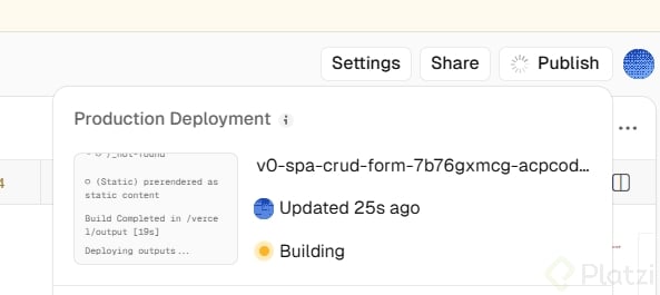 Al deployear desde Vcero, tu proyecto corre en Vercel, la misma plataforma detrás de sitios con millones de usuarios como Nike. Desde la opción de publish, puedes abrir el enlace y usar Inspect on Vercel para ir directo al deployment y ver cada versión que subiste.