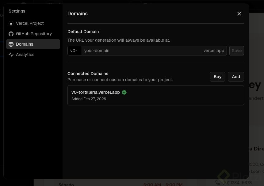 Desde domains, cambia el dominio por defecto que te asignó Vcero. Puedes editar el subdominio .vercel.app o comprar un dominio y dejarlo integrado en pocos pasos.