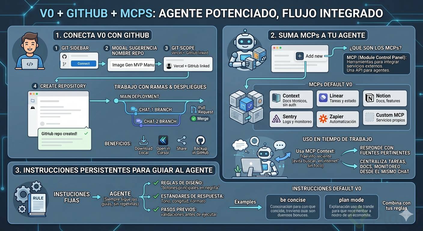 Conecta tu proyecto en V0 con GitHub y suma MCPs para ampliar las capacidades de tu agente sin salir de tu flujo. En minutos, tendrás código versionado, ramas por chat y automatizaciones que consultan documentación, tareas y monitoreo en tus herramientas favoritas.