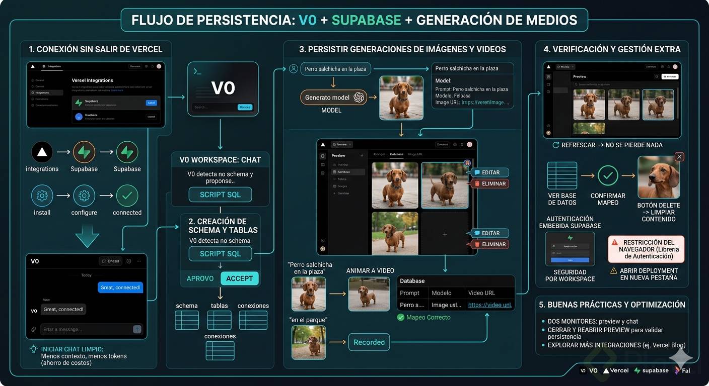 V0 ya genera imágenes y las anima a video, pero al refrescar se pierde el estado por no haber base de datos. La solución es conectar Supabase desde Integrations en Vercel: se elige Supabase (hay otras opciones como Amazon DSQL, Neon o Redis), se hace install y se sigue un flujo similar al de Fall. Sin salir de Vercel: continue, nombre, create, done, y vuelves al chat de V0 con la conexión lista.