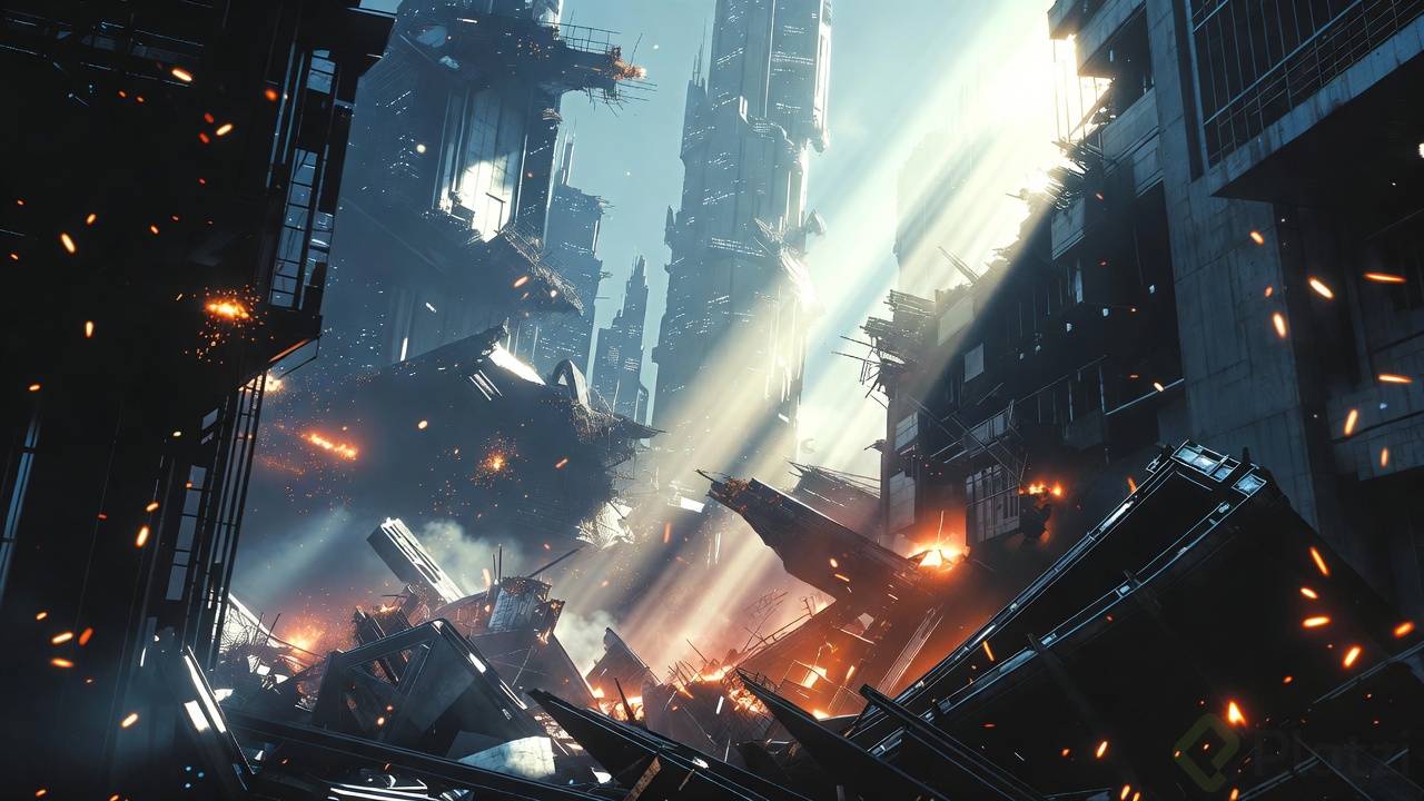 - Explosiones: Futuristic street erupts in flames, shockwave blowing out windows (shake tilt).