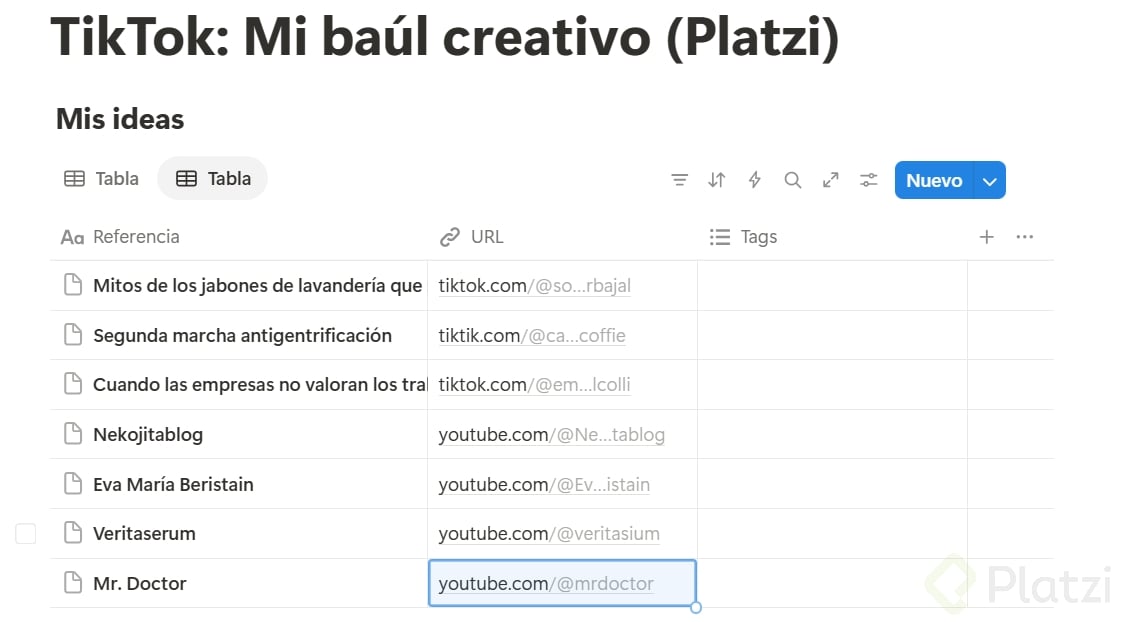 A medida que te vengan nuevas ideas, añádelas en tu página de Notion. Puedes utilizar tags para clasificarlas por tema, formato o contenido. De esta manera, podrás filtrarlas y encontrarlas fácilmente cuando las necesites en el futuro.