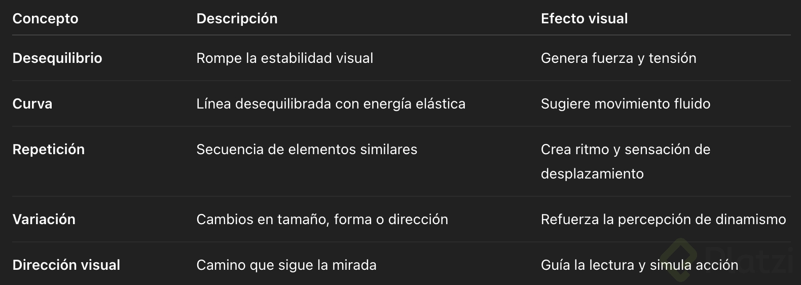 Este principio es valioso cuando se busca dinamismo dentro de composiciones visuales, pues se puede manipular la forma de líneas y figuras para inducir una reacción emocional en el espectador.
