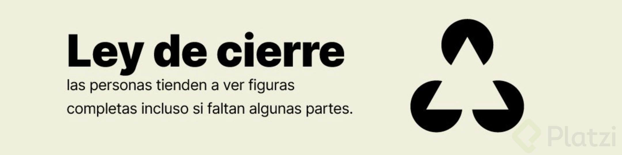 Nuestro cerebro siempre busca cerrar y completar las figuras visualmente. La ley del cierre se aplica cuando percibimos una figura incompleta, como un círculo sin un segmento. Aunque falte una parte, nuestra mente interpreta la imagen como un círculo completo. Otro ejemplo son tres círculos con un espacio triangular en medio que el cerebro inmediatamente transforma en un triángulo imaginario.