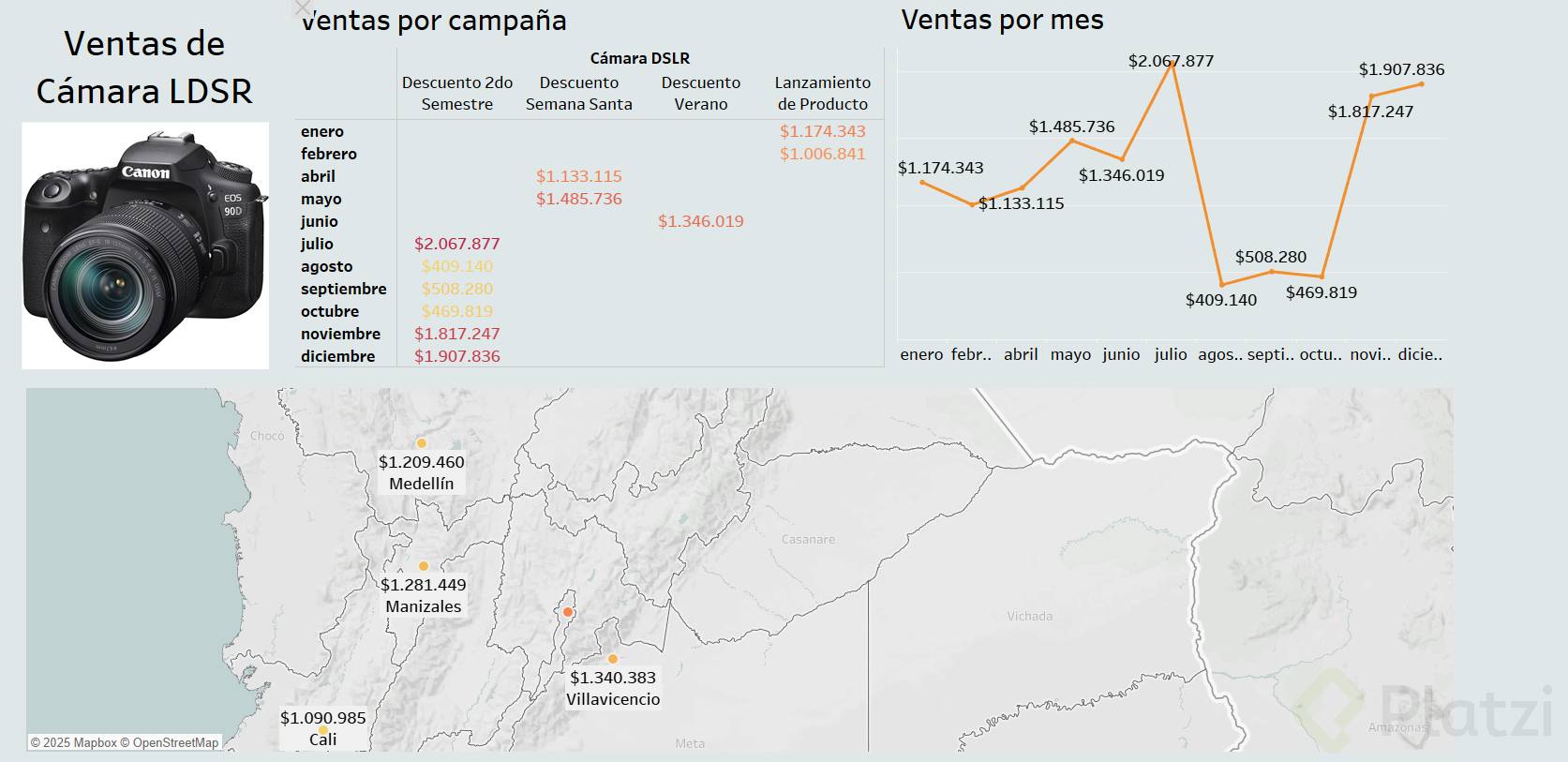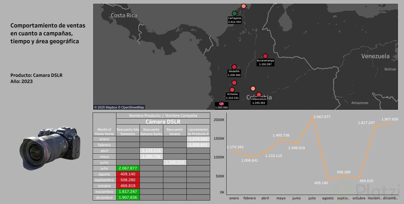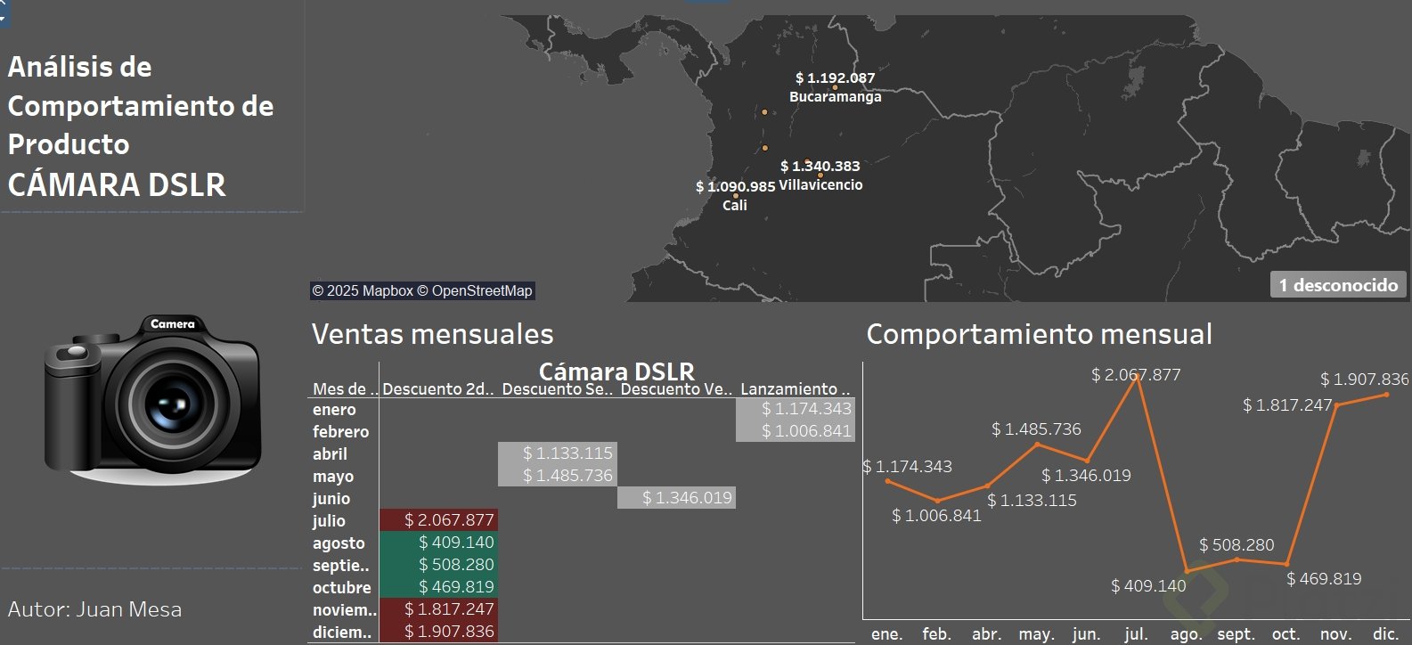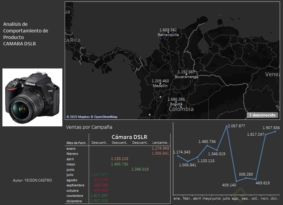 Un enfoque estratégico implica seleccionar un artículo específico que genere exclusividad con el fabricante, abriendo nuevas vías para ventas y negocios. En este caso, se optó por enfocarse en una cámara de fotografía, permitiendo analizar el impacto de diferentes campañas de marketing en sus ventas a lo largo del año. Mediante herramientas de visualización como Tableau, pudimos identificar qué meses fueron los más exitosos y cuáles requirieron mejoras.