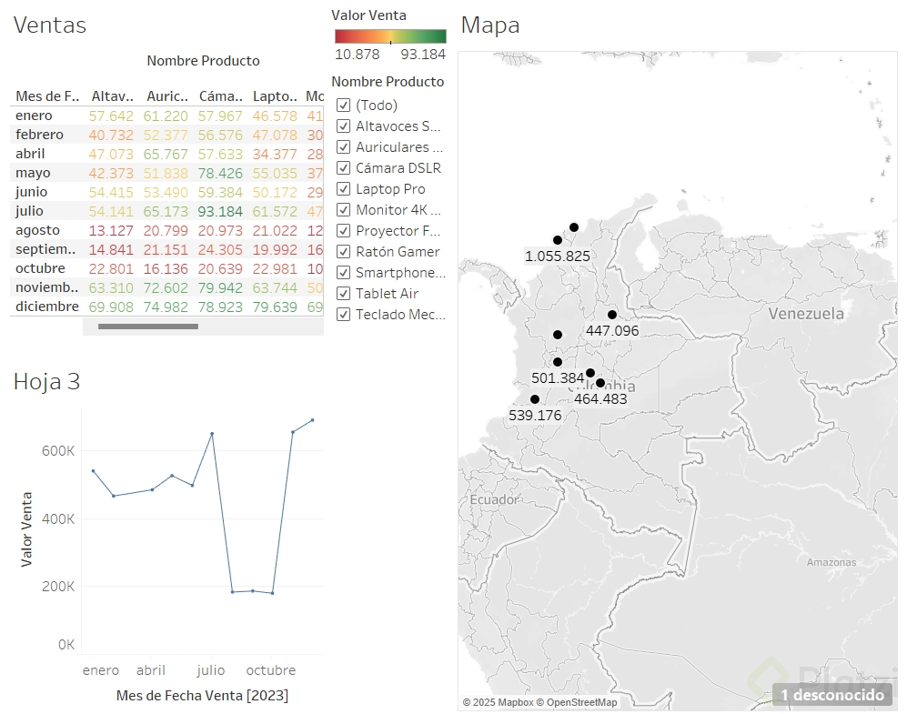- Gráfica de ubicación: Colocada en la parte superior para resaltar la importancia de la geolocalización en las ventas.