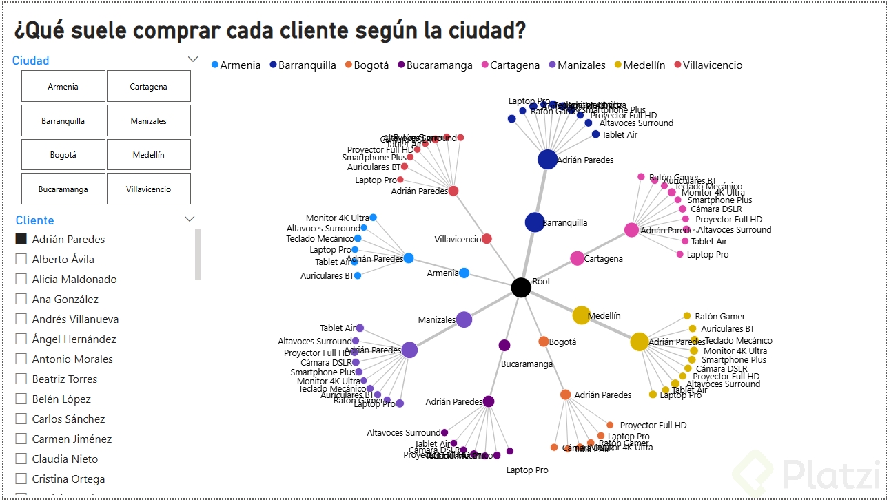 - Configura las categorías y medidas: Agrega datos a las categorías del gráfico según la jerarquía requerida. Por ejemplo, primero la ciudad, luego el nombre del cliente, y finalmente los productos.