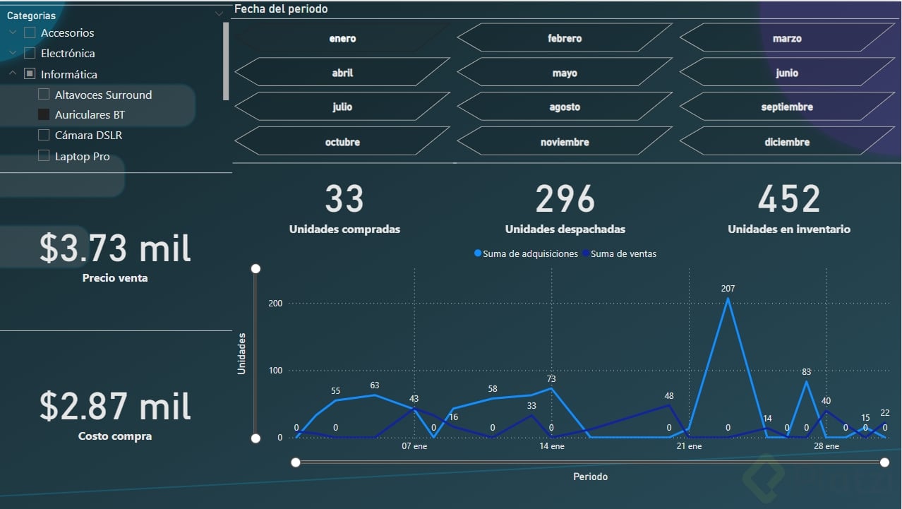 - Asigna identidad cromática: el color de “unidades compradas” en la tarjeta coincide con su serie en las gráficas.