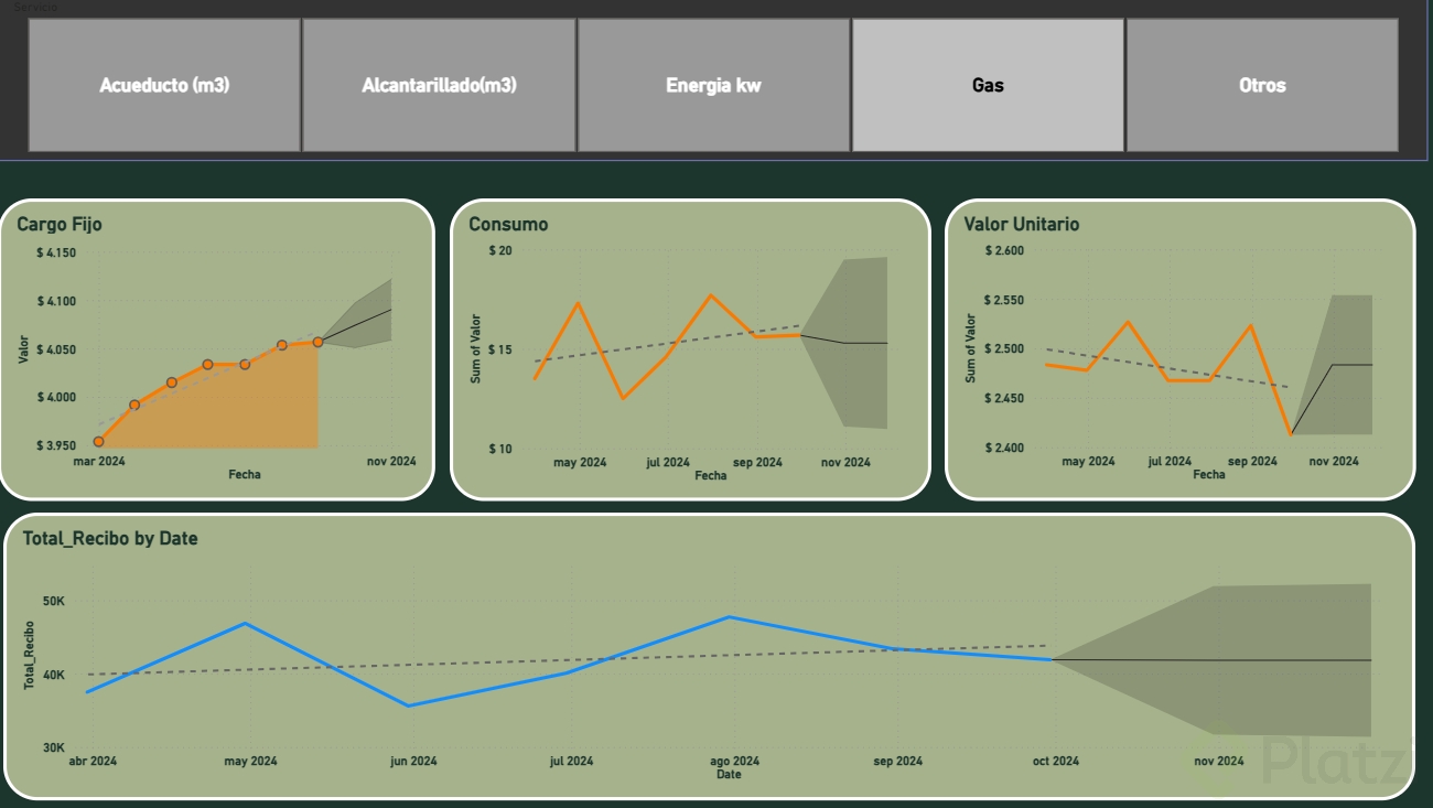 - ¿Cómo presentar el comportamiento por servicio (alcantarillado, luz, gas) de forma visual y filtrable?.