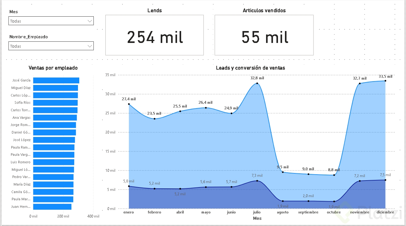 - Gráfica del comportamiento de ventas: Usar una gráfica de líneas centralizada y amplia para mostrar la evolución de ventas en el tiempo.