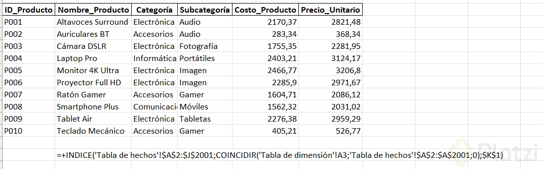 - Dimensión de los productos: Creamos una tabla con productos únicos que describe cada artículo con su ID, nombre, categoría, costo, y precio unitario.