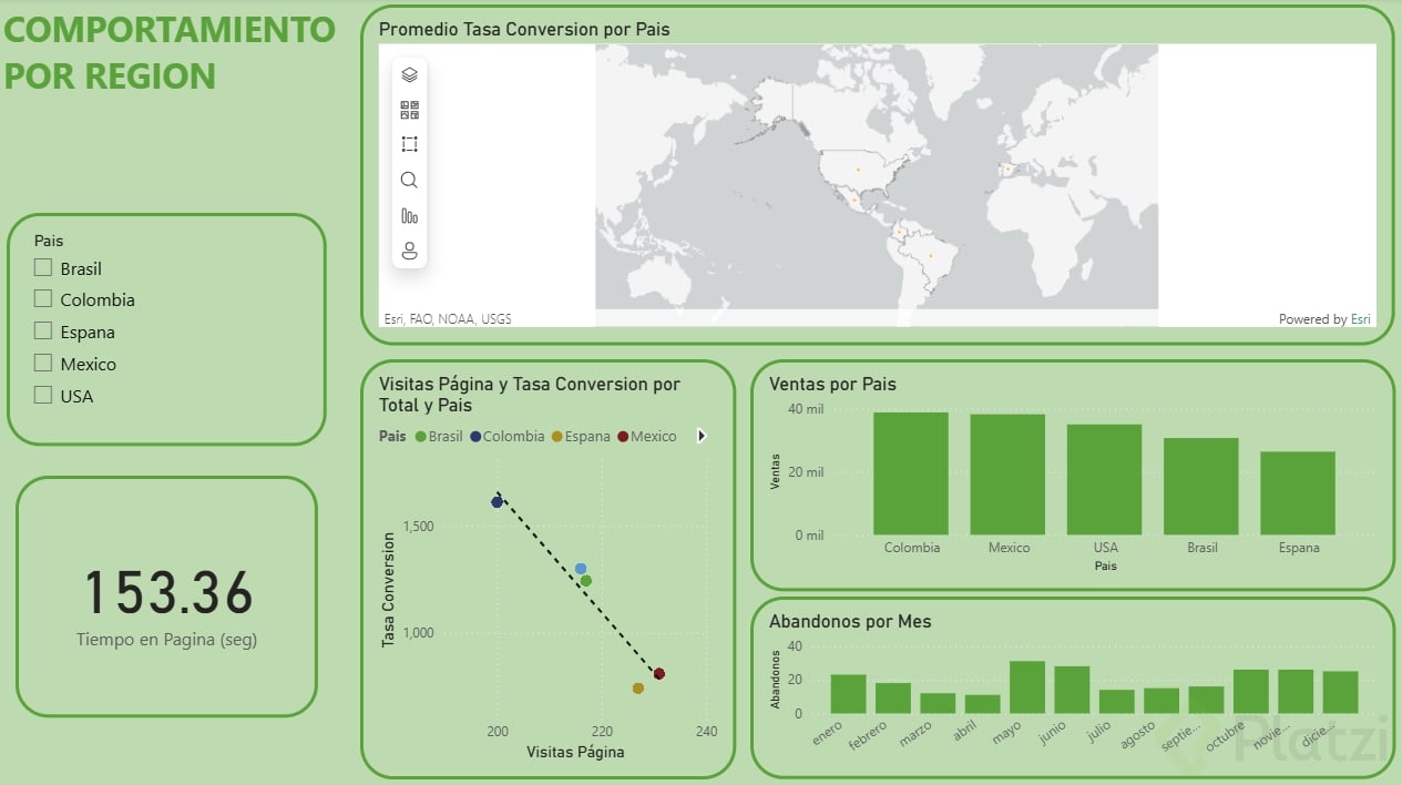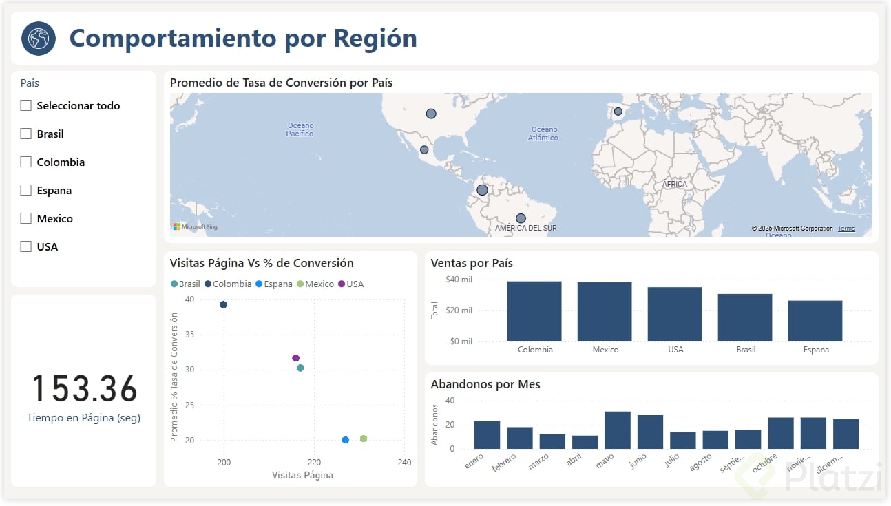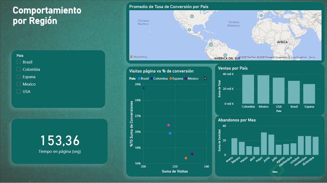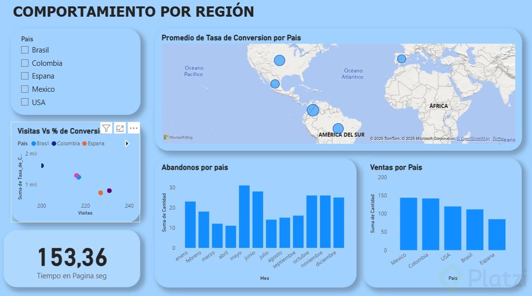 - Filtros interactivos: Permiten al usuario observar cómo cambian los patrones de comportamiento según seleccionen diferentes países en el filtro.