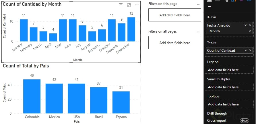 - Gráfica de barras: Utilice estas para observar la cantidad de abandonos por mes. En el eje x, coloque la variable de tiempo y en el eje y, los datos de abandonos.