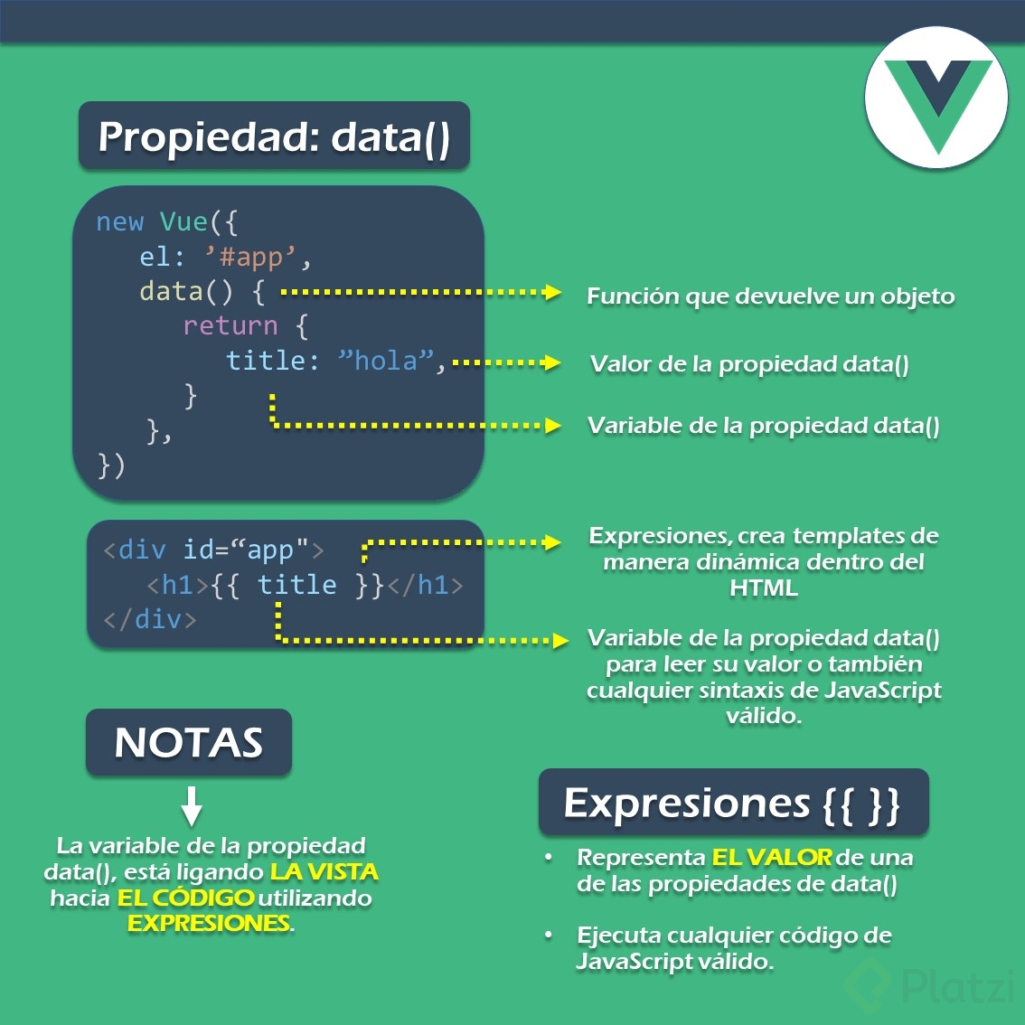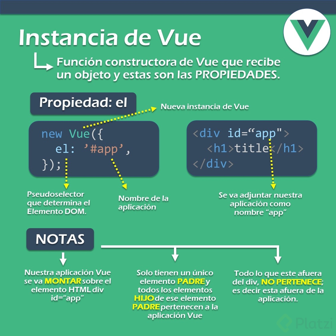 const app = new Vue({ el: '#app', data() { return { title: 'Hola Vue' } } });- el: Es un selector pseudo CSS que determina el elemento del DOM donde se "montará" Vue.