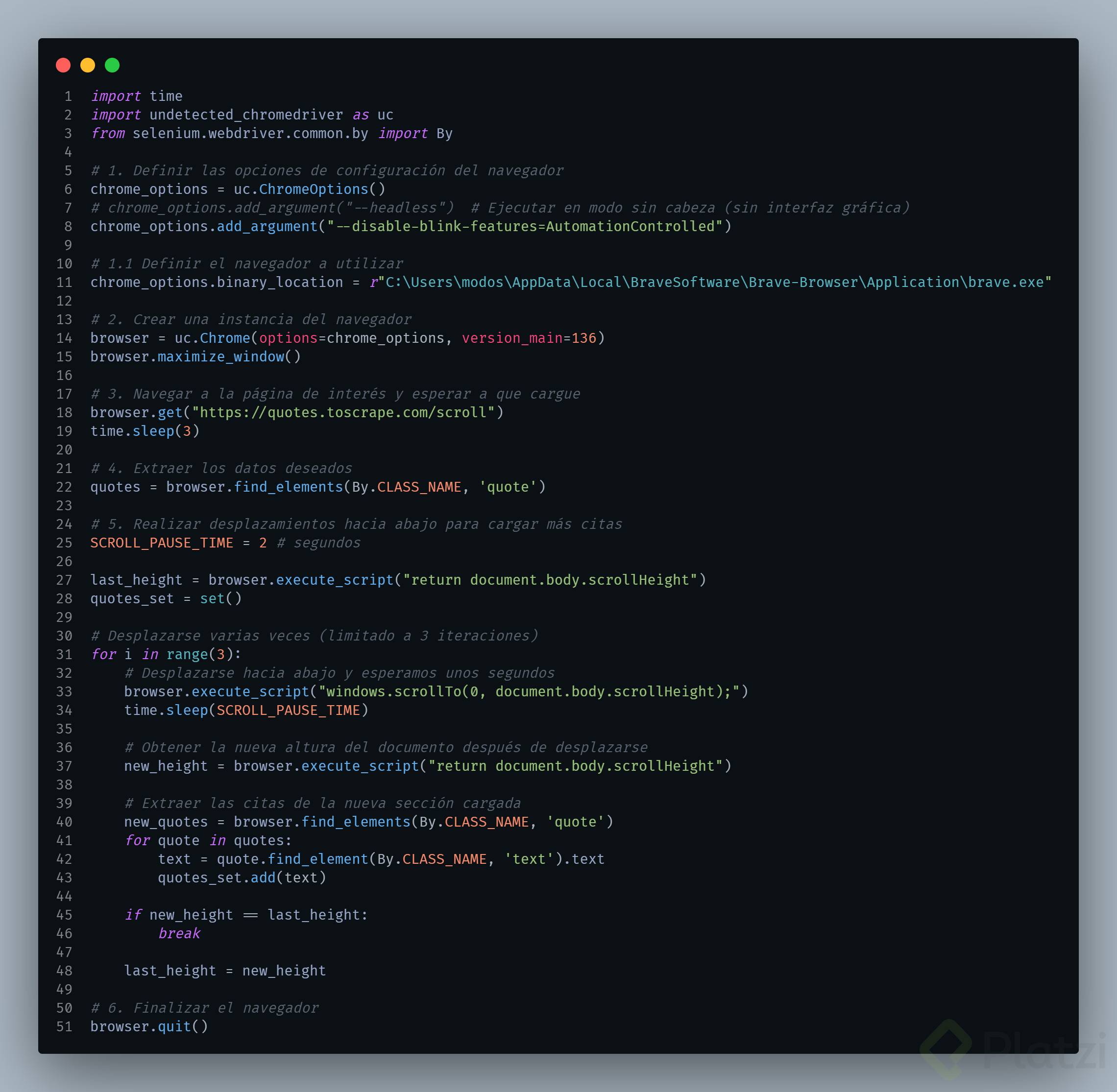 Primero, utilizamos el mismo navegador web automatizado (driver) que ya conocimos, realizamos la petición a la URL, pero añadimos un script específico que realice el scroll regularmente en la página web.