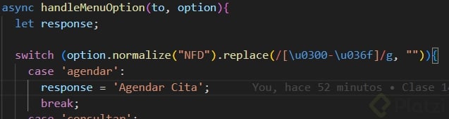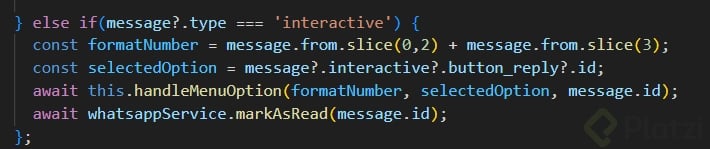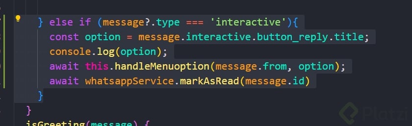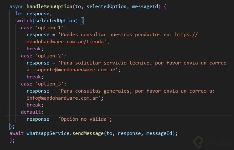 Una vez capturada la interacción, crearemos una función llamada handleMenuOption para manejar las acciones basadas en la opción del usuario. Esta función permitirá construir el flujo de respuestas esperado.