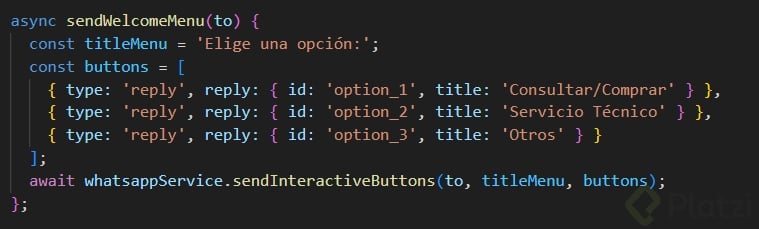 Después de determinar la opción que el usuario eligió, enviaremos una respuesta. Para mantener una buena comunicación, es importante reutilizar el servicio de mensajes de WhatsApp en modo texto, evitando crear múltiples lógicas para manejar diferentes tipos de mensajes.