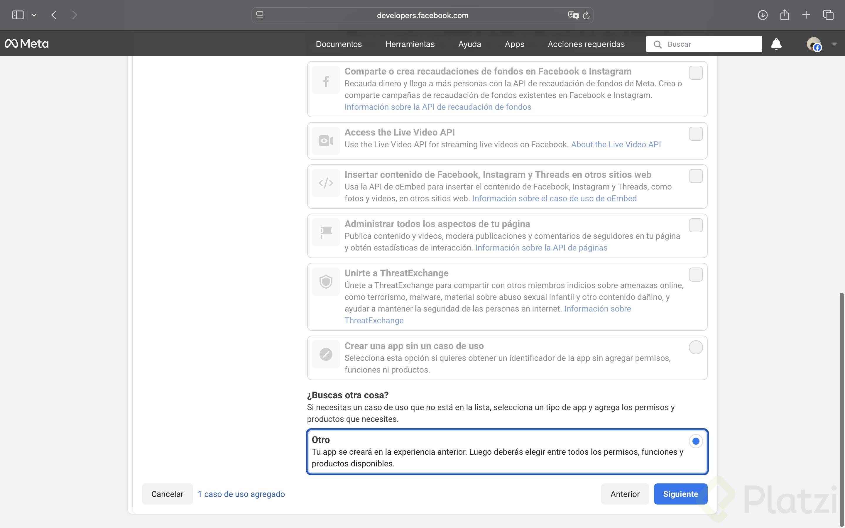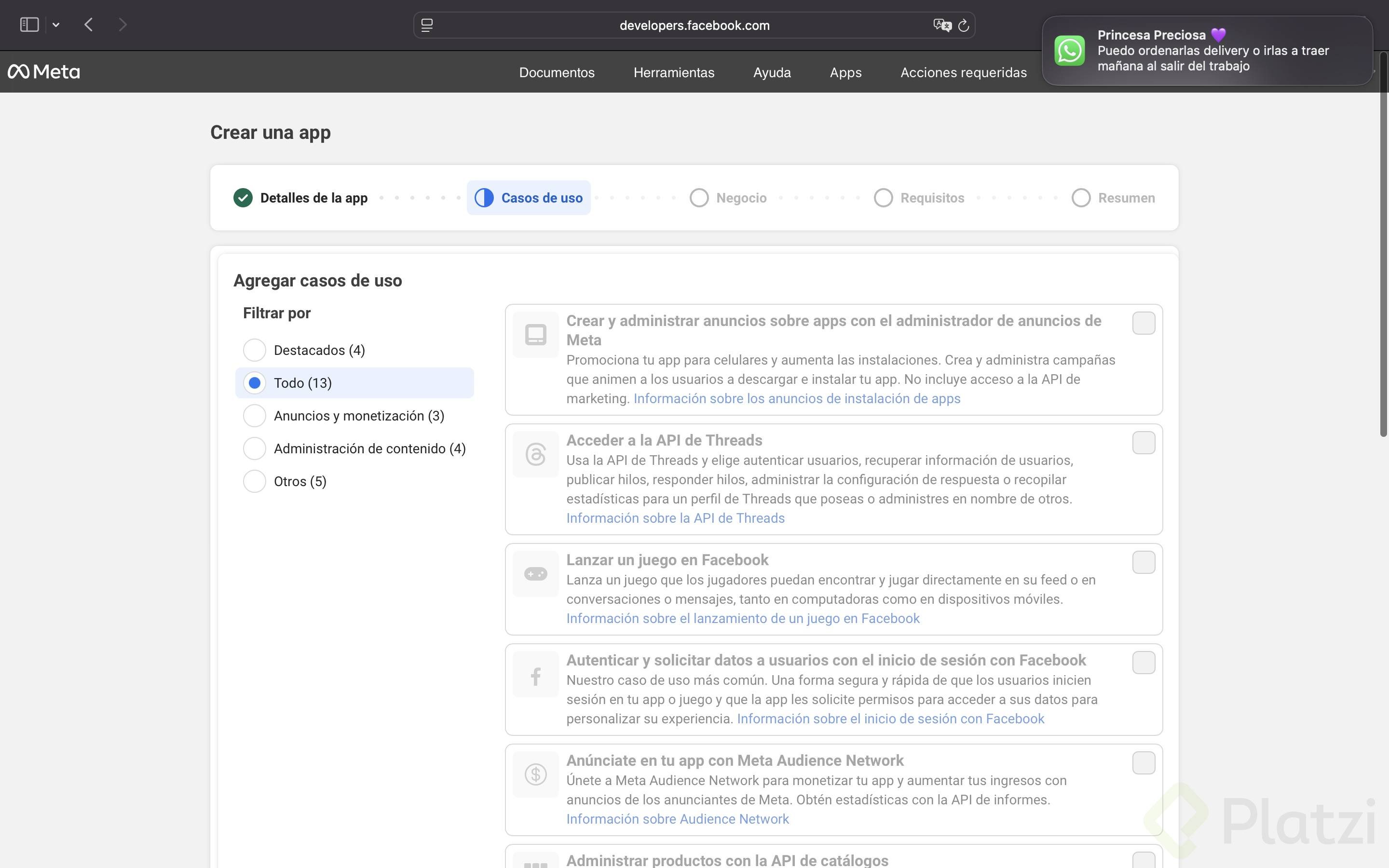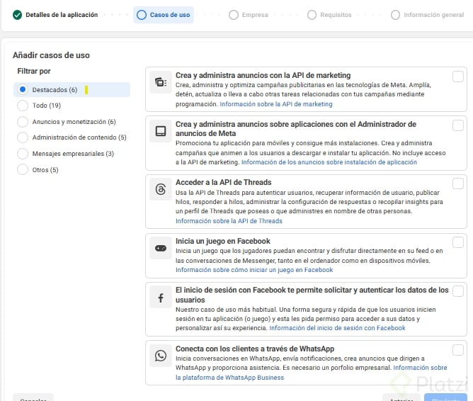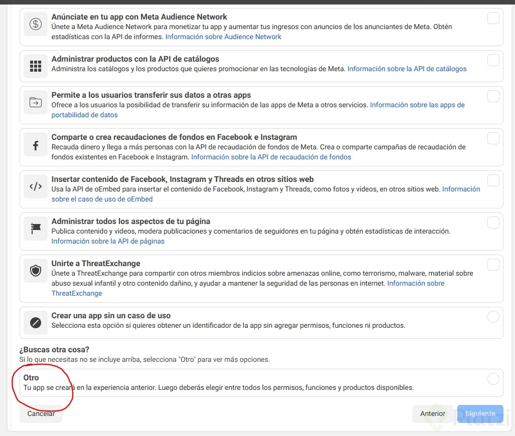 Al seleccionar el tipo de aplicación, Meta te preguntará sobre qué deseas que haga tu aplicación. Ahí debes prestar mucha atención, ya que la elección determinará los recursos a los que tendrás acceso. Si estás interesado en negocios, busca la opción relacionada, ya que ahí podrás explorar la API de WhatsApp. Una vez que selecciones la opción adecuada para tus necesidades, podrás avanzar en el proceso de configuración.