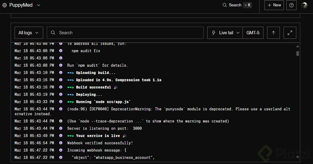 Una vez hecho el despliegue, obtendrás una URL única. Aunque esta no será pública, es esencial para la comunicación con la API de Meta. Para verificar que todo funcione:
