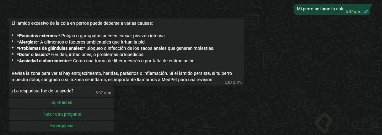 Una vez que toda la lógica esté en su lugar, es importante validar y probar el flujo completando varias interacciones, evaluando tanto la precisión de las respuestas del GPT como la funcionalidad de los botones de interacción. Invita a los usuarios a probar preguntando: "Mi perro tiene dos días sin querer comer y está vomitando", para recibir respuestas y verificar si las opciones de interacción funcionan correctamente. Sin embargo, recuerda personalizar cualquier mensaje automatizado conforme a la sensibilidad de los usuarios.
